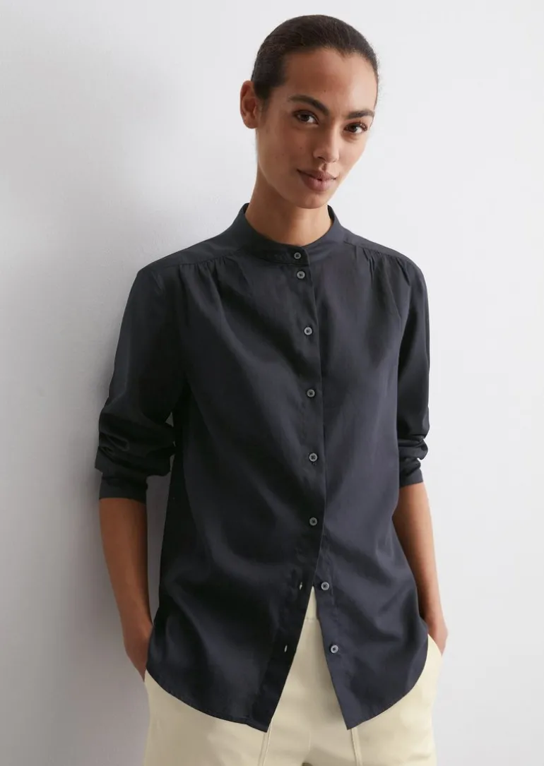 Stehkragenbluse relaxed aus softem Baumwoll-Satin in blau