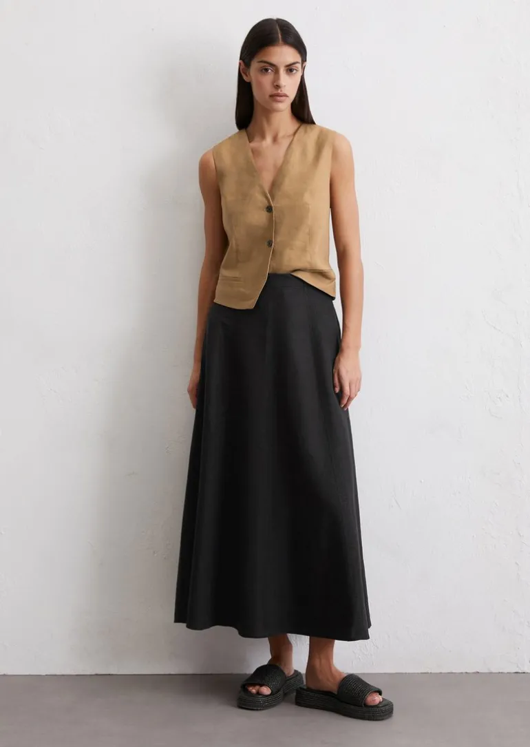 Ausgestellter Leinen-Midirock mit seitlichem Reißverschluss in schwarz