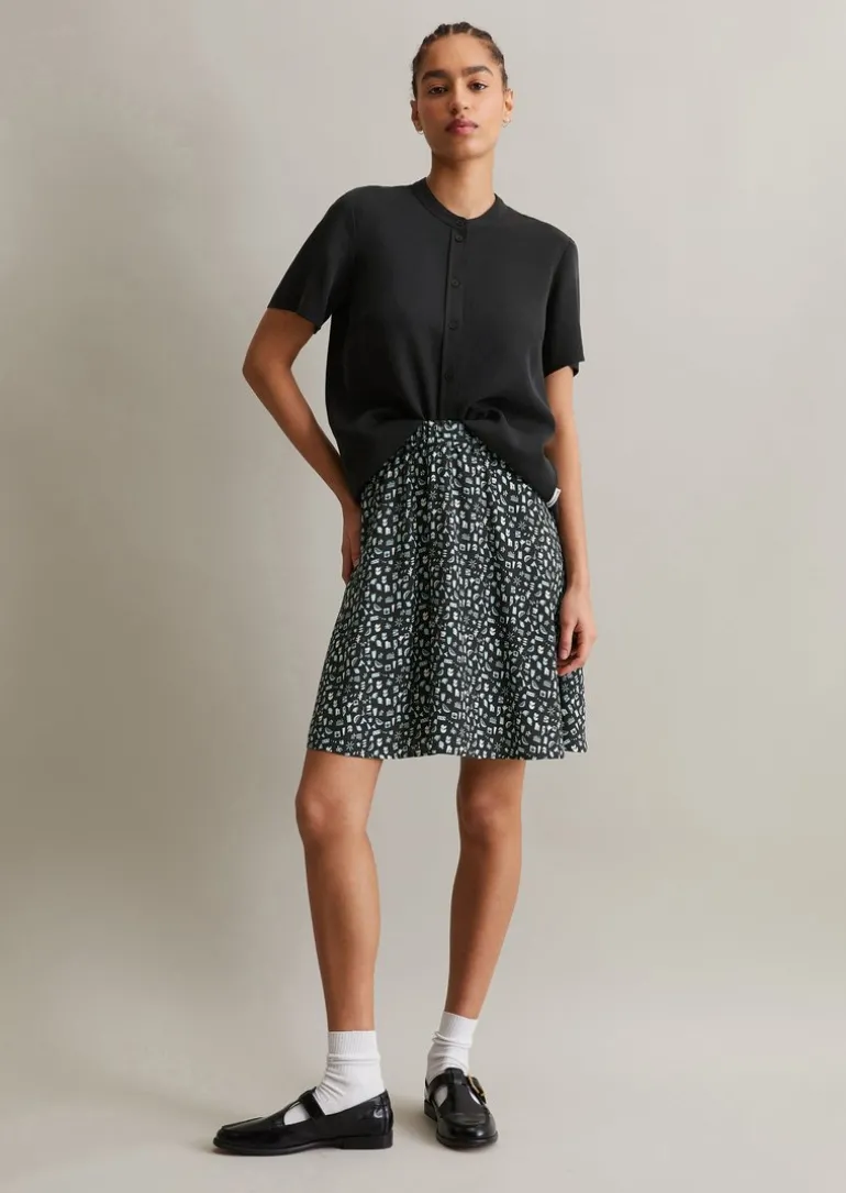 Ausgestellter Minirock aus bedrucktem Viskose-Crêpe in grau