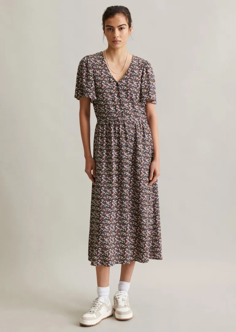Blümchenkleid regular aus bedrucktem Viskose-Crêpe in braun