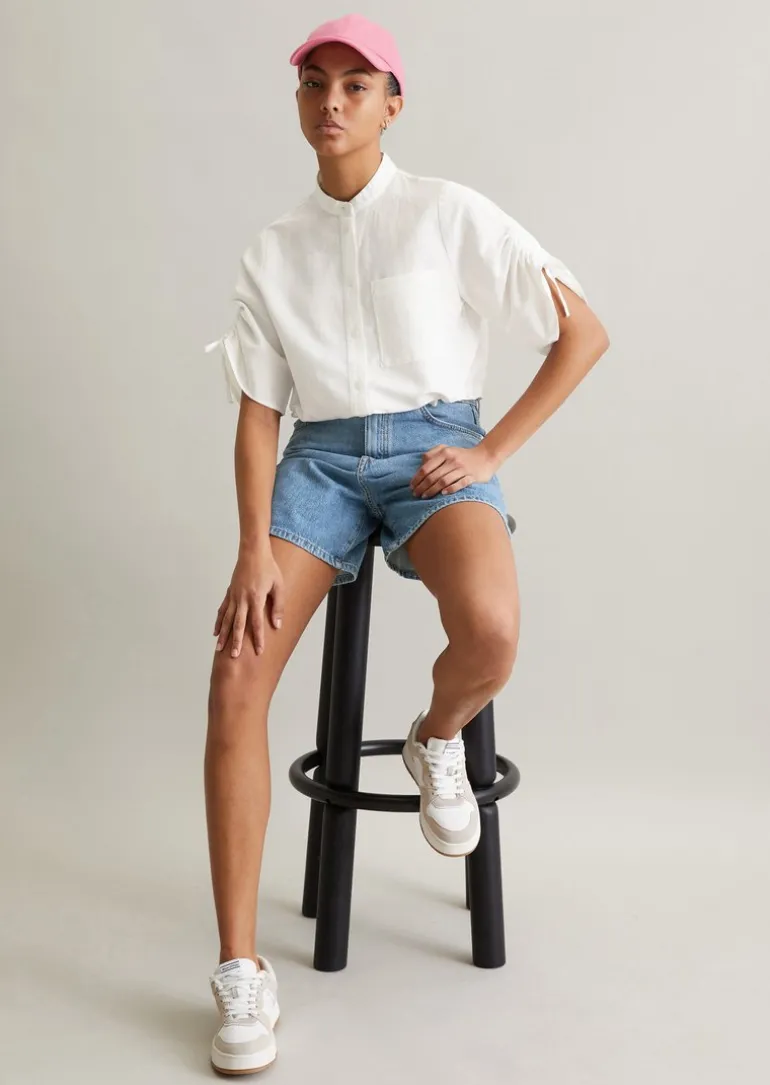 Kurzarm-Bluse relaxed mit Tunnelzug-Details in weiss