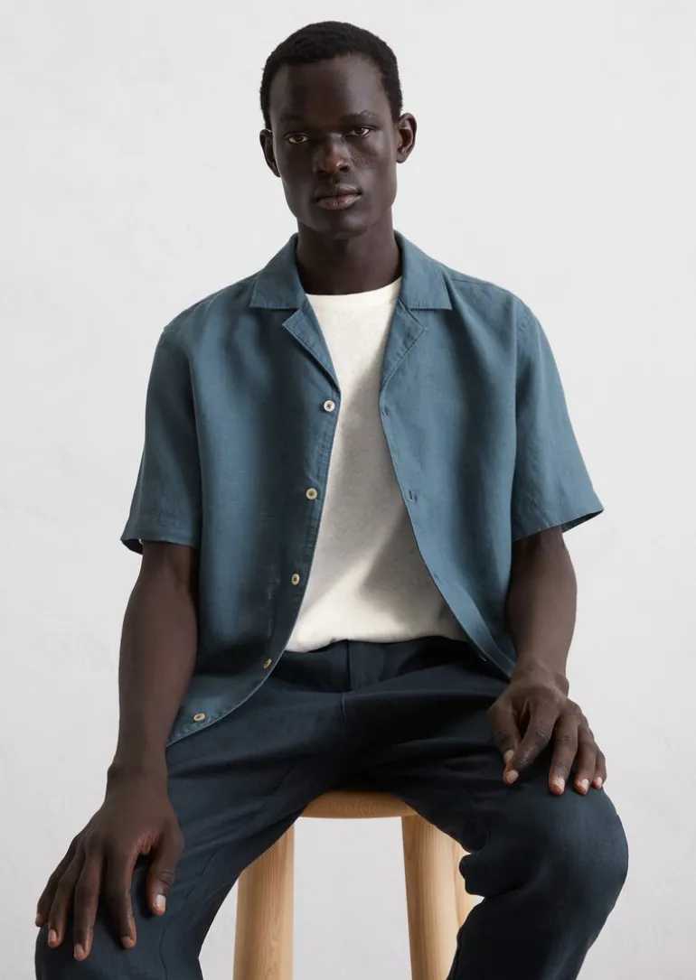 Kurzarm-Hemd regular aus reinem Leinen in blau