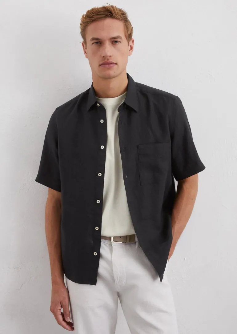 Kurzarm-Hemd regular aus reinem Leinen in schwarz