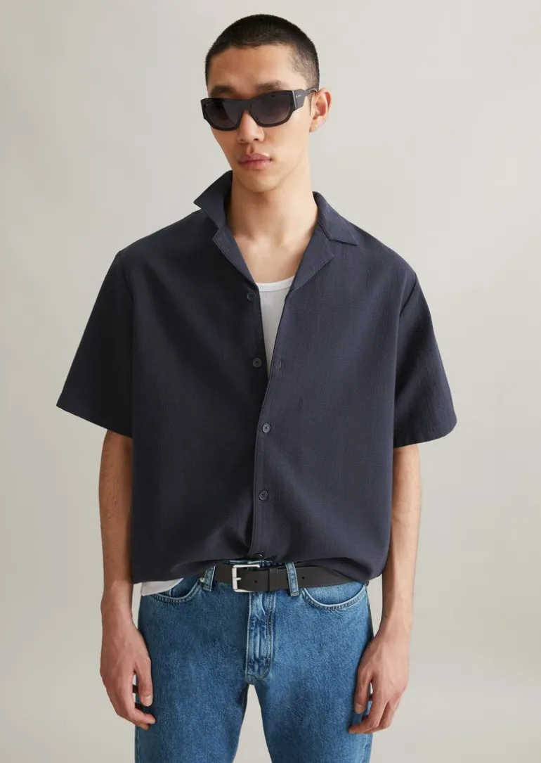 Kurzarm-Hemd regular fein strukturiert aus Bio-Baumwolle in blau