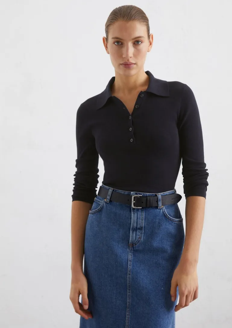 Polo-Pullover slim in feinem Rippenstrick in blau