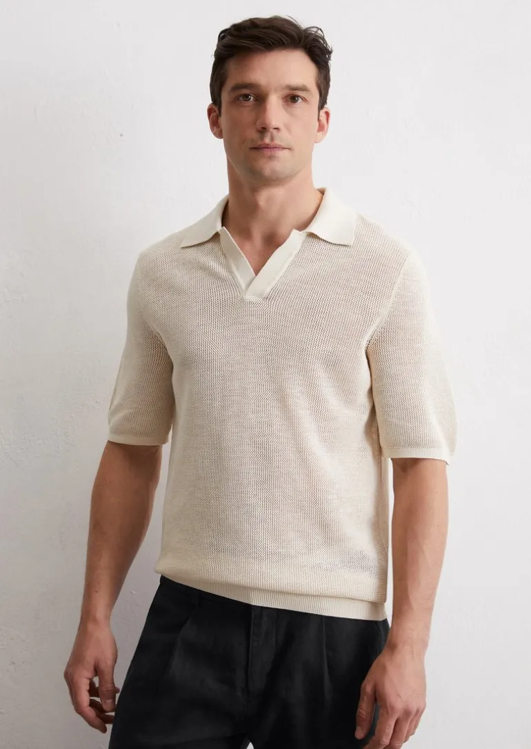 Strick-Poloshirt regular aus Bio-Baumwolle und Leinen in weiss