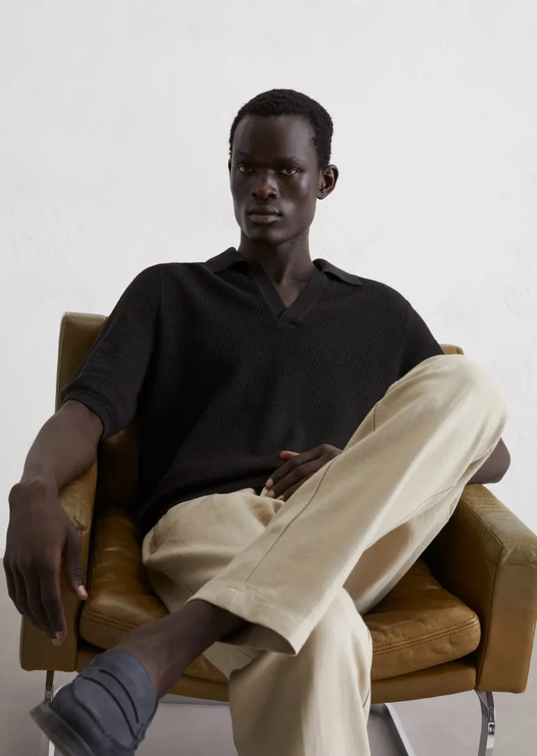 Strick-Poloshirt regular aus Bio-Baumwolle und Leinen in schwarz