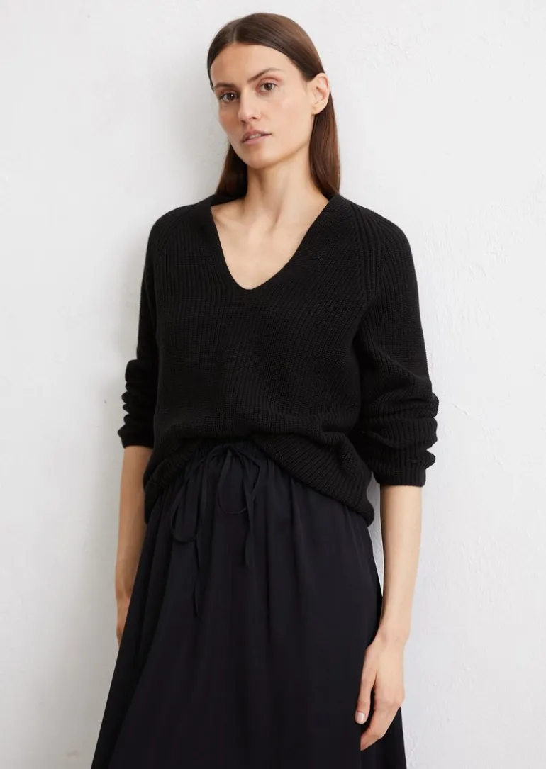 V-Neck-Strickpullover slim aus softem Baumwoll-Garn in schwarz